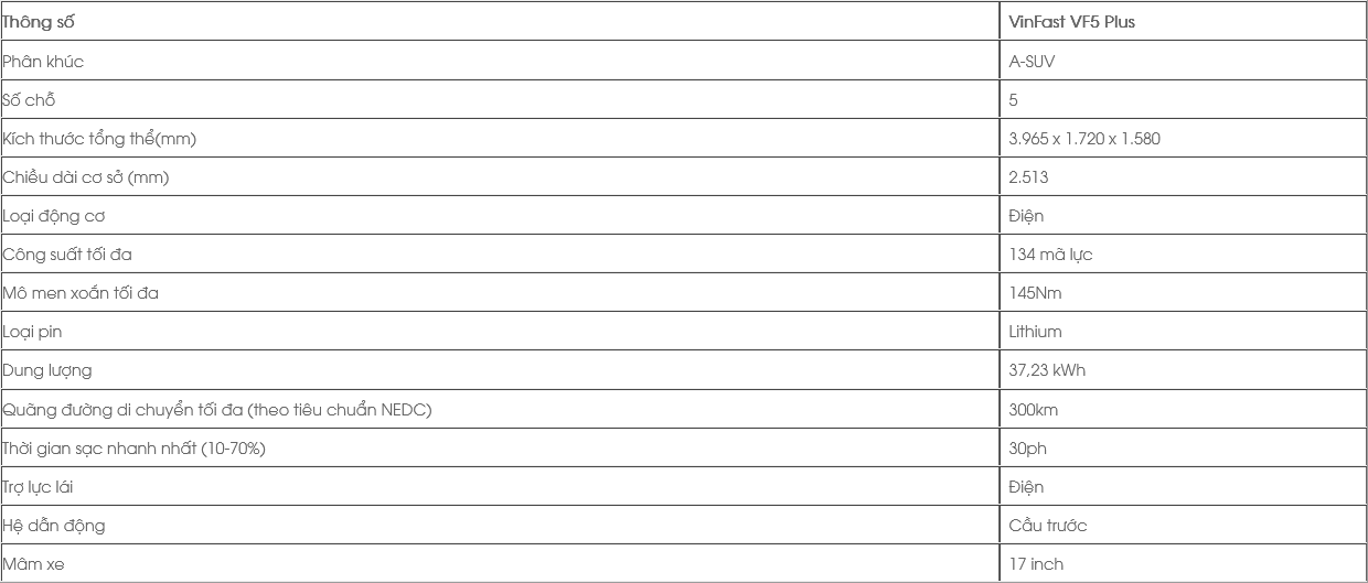 Bảng thông số kỹ thuật VinFast VF5 Plus: